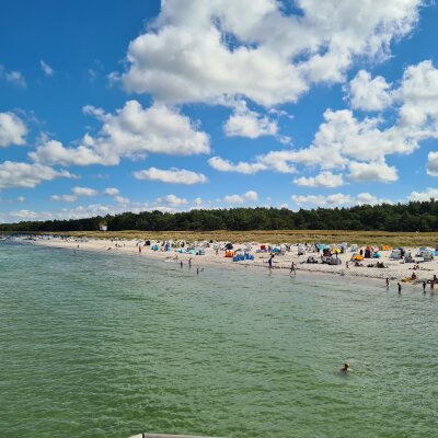 Ursprüngliche Fischerdörfer mit reetgedeckten Katen, Bernsteinstrände, der majestätische Darßer Urwald und ene malerische Boddenlandschaft prägen das Bild der Halbinsel. Unser Unterkunft: Ostseehotel Dierhagen, 3 Sterne superior Hotel mit Schwimmbad Impressionen aus 08/2025, Strand von Prerow: Foto (ewi) unten